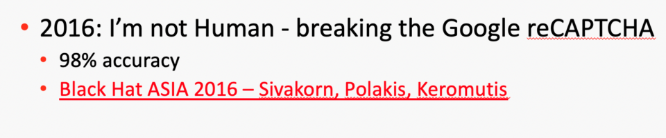 Case in point: In 2016 at BlackHat Asia, some presenters shared that they were 98% successful at breaking these mechanisms. 98%! We, as humans, are probably nowhere near that success rate. Personally, I’m likely at 70-80%, depending on what words (and backwards letters!) CAPTCHA presents while I’m rushing to get my work done. Even with picture CAPTCHA, I pass maybe 80% of my initial attempts; I can’t ever get those “select the edges of street signs” traps! So, what if bots are successful 98% of the time and humans only average 70%?
