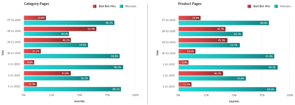 - 40.1 percent of the traffic of category pages and 45.3 percent of the traffic on product pages was bots during Black Friday.